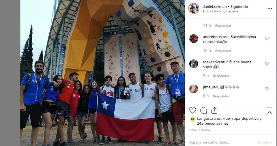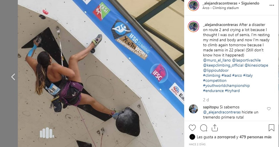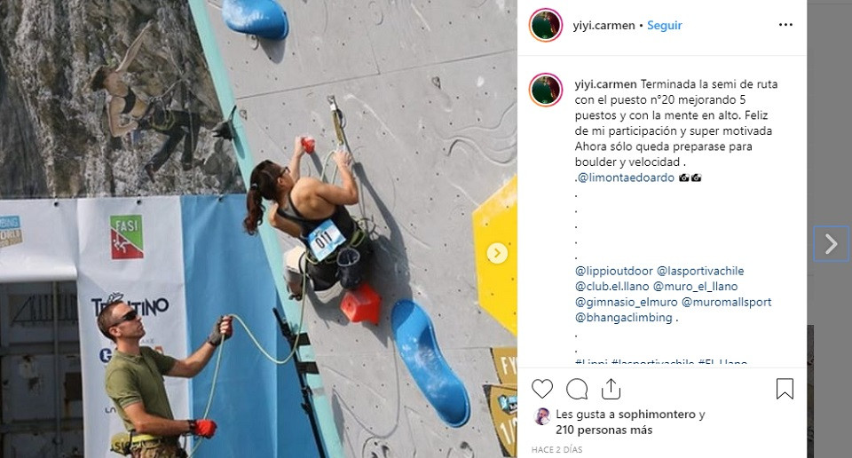 «No hay palabras…Hace dos años, pensar en hacer 10 segundos en la ruta de la velocidad sonaba loco. Hoy hice mi mejor tiempo hasta ahora y batí nuevamente el récord nacional con 8’78. Y también (por primera vez en mi vida) clasifiqué para las finales de velocidad en mi último #youthworldchampionship, todo ha sido tan extraño e increíble..No sé qué esperar ahora, así que daré todo mañana.Y sí, esta es la primera vez que voy por debajo de 9 GRACIAS, esta vez a mis entrenadores de velocidad @migueliuliani y @ toledoricardo1990, que fueron mis primeros entrenadores de velocidad, y @climbtrainer (lo siento @richard_m_morales pero ustedes son más para ruta y boulder, gracias de todos modos jajaja.»