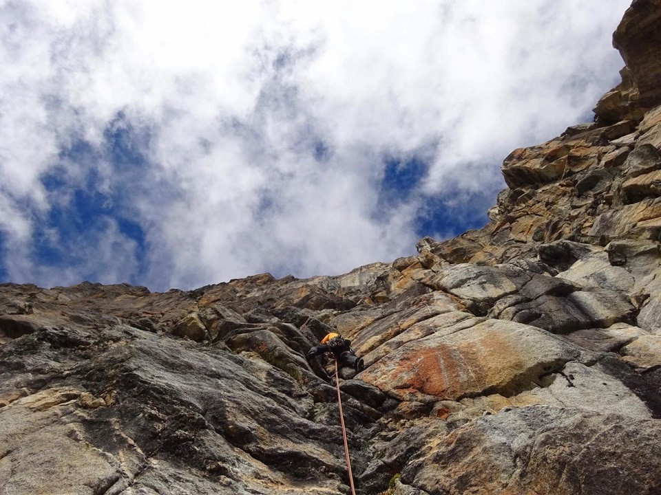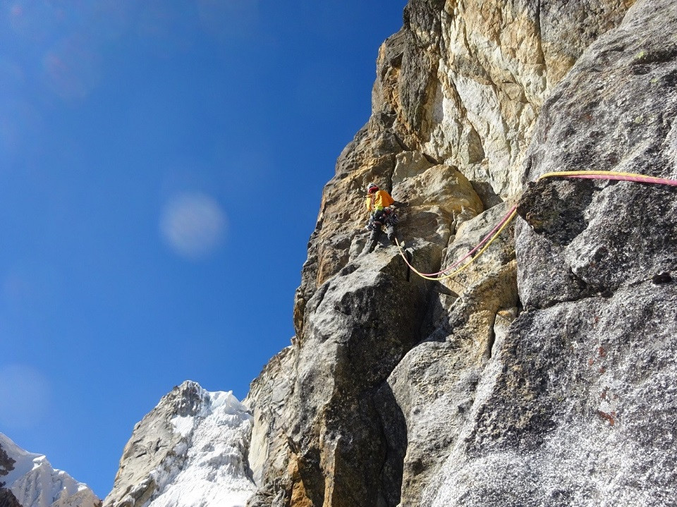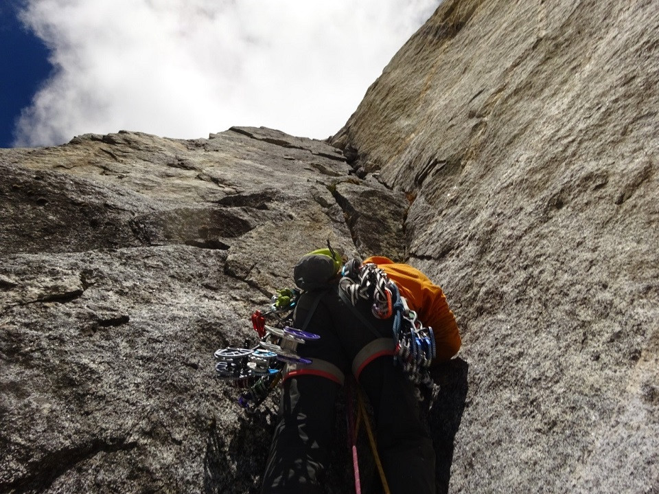 “Se sentía bien, se sentía que ésta era la vuelta a la montaña que necesitábamos, que por lo menos yo necesitaba, relativamente en nuestra zona de confort, un bigwall de granito, pero también con tremendo desafío por delante. Era la vuelta justa, después del momento tan duro, tan intenso en la cordillera blanca. Sentía que nos estaban abriendo los brazos otra vez y que nos iba a dar la pasada. Así es que al siguiente día le entramos con todo, con mucha energía. Jumareamos las cuerdas fijas antes del amanecer y a primera luz ya estábamos arriba del diedro gris, listos para seguir abriendo, explorando y tratando de conectar los distintos sistemas de fisuras, uniendo la línea lo más recto y directo que podíamos. Conectamos unas rampas de roca, unos diedros tumbados, también unos largos duros, boulders expuestos y muy aéreos. Una aventura. Casi toda la ruta la pudimos pasar en libre, excepto una fisura media desplomada, que para conectar una sección protegible con la otra y seguir la ruta para arriba, tenías que pasar por ella. Comenzaba de dedos, continuada con manos y rápidamente se transformaba en un offwith, que para poder conectar tuvimos que artificiar. Al terminar esa sección nos dejaba en una secuencia media tumbada que conectaba con el filo.”