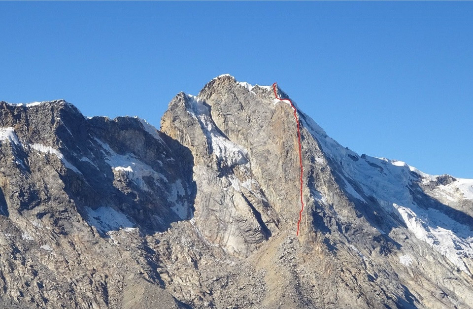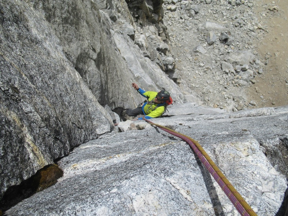 “En las fotos poco se podía distinguir la calidad de la roca, pero desde ahí veíamos un diedro gris bien marcado y limpio. Queríamos escalar una línea vertical y directa en esa zona y sabíamos que al final del último largo saldríamos al filo norte que resultaría ser la ruta original de esta montaña, que se llama “ya pe´on” o la “arista de los españoles”, según con quien hables, abierta el 2011 por el español Carlos Cabezas y el peruano Diego Fernández.”