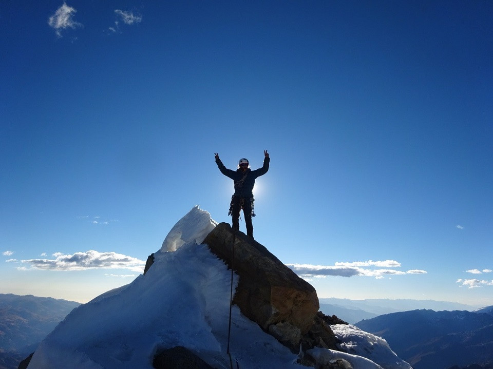 “Tuvimos que hacer una travesía de 50 mts y nos encontramos con la pirámide sumital, que era un castillo de bloques y hielo, que con la precipitación y temperaturas de la semana anterior se habría congelado, lo que nos obligó a escalar con guantes y crampones”. Luego de escalar dos largos de mixto M3 lograron salir a la cumbre del Cashan Oeste, montaña que tiene dos cumbres, sin embargo, la cumbre principal estaba muy descompuesta y riesgosa para montarse.