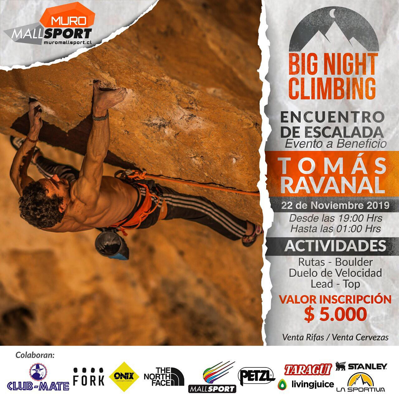 Éste viernes 22 de noviembre se llevará a cabo en el Muro del Mall Sport el evento Big Night Climb, un encuentro de escalada a beneficio del deportista nacional Tomás Ravanal, quien se encuentra en recuperación de una lesión que lo mantiene fuera de las paredes hace 1 año y 8 meses.