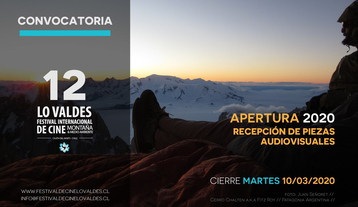 Esta oficialmente abierta la Convocatoria audiovisual 2020 para participar del doceavo Festival internacional de cine de montaña & medio ambiente Lo Valdes, puedes inscribir tus producciones ingresando a www.festivaldecinelovaldes.cl. Aquí encontraras las bases y el formulario de inscripción para participar de este importante certamen anual, que rescata nuestra tradición Andina, promoviendo la cultura de montaña y el cuidado del medio ambiente en lo mas alto del Cajón del Maipo. La convocatoria se mantendrá abierta hasta el 10 de marzo para el FICMLV2020.