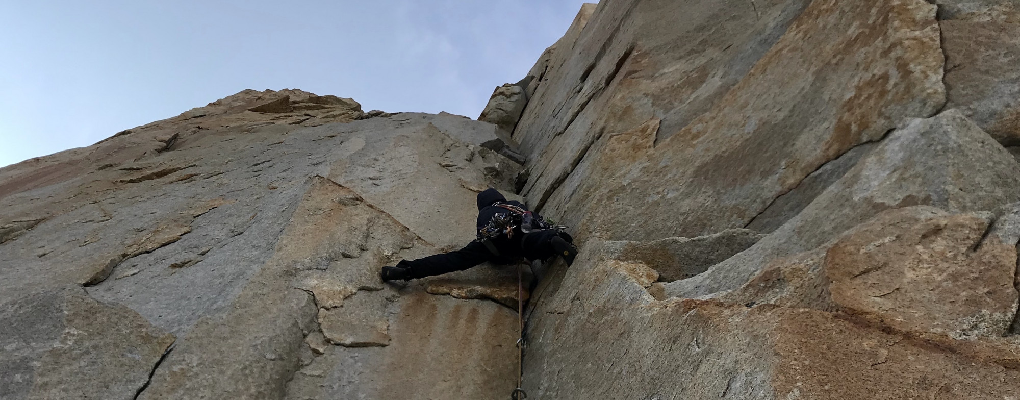 Suena la alarma y el viento juega ajedrez con la mente. Ráfagas repentinas han azotado el campamento toda la noche, y la supuesta ventana de buen clima esta dudosa. Atrasamos la alarma aunque no volvimos a dormir, escuchando y analizando el viento. A las 8 de la mañana las ráfagas se calmaron hasta los 40 kilómetros por hora, al menos podríamos rescatar el equipo que dejamos en la pared. A las 9 estábamos encima del primer largo, el frio y el viento no son suficiente como para reprimir nuestras ganas de explorar los siguientes largos: un diedro de 80 metros con una fisura de manos partiéndolo por la mitad.