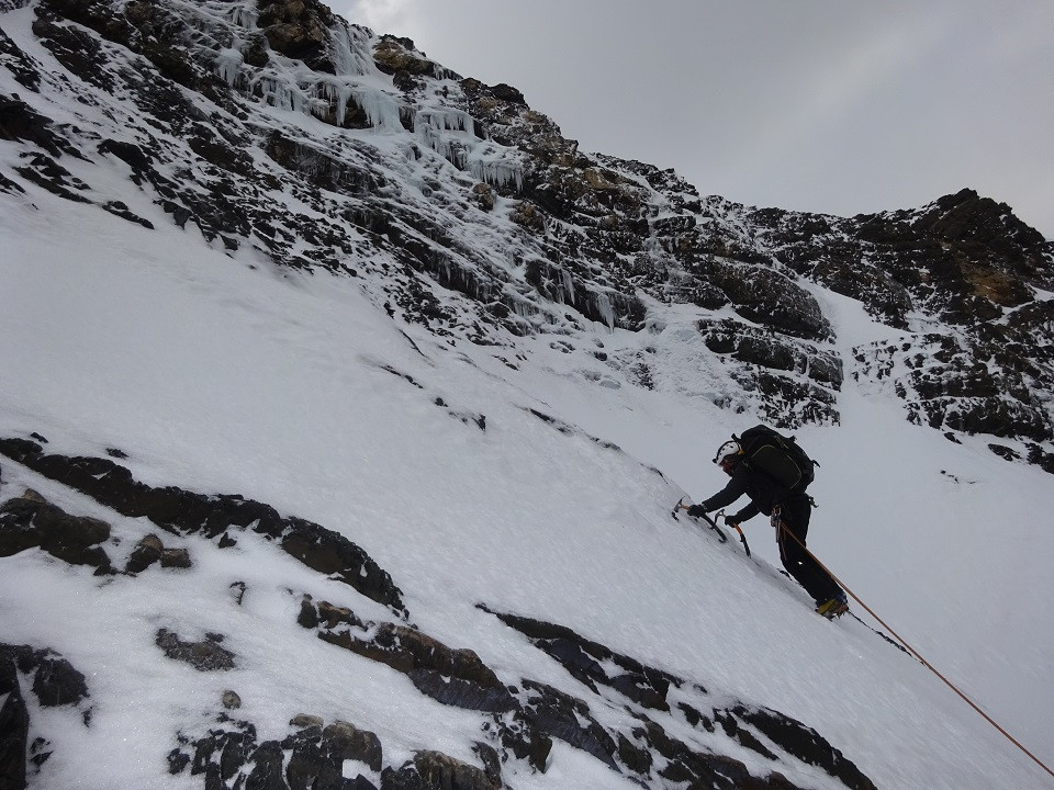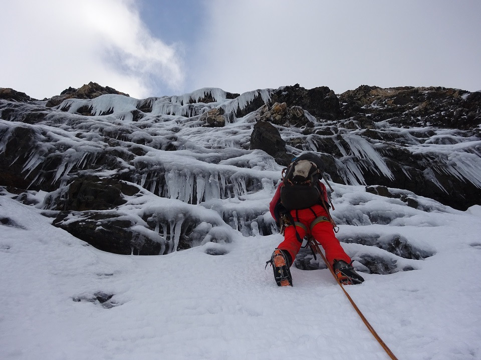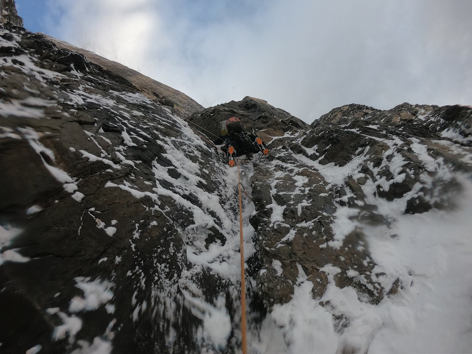 Las condiciones no tan perfectas como las esperadas hacen que este largo sea muy entretenido, el Nico avanza delicadamente sobre la roca finamente tapizada por la nieve y el hielo, el talento sobresale y más pronto que tarde nos vemos en una pequeña repisa que alberga una excelente fisura horizontal, un tramo más de este alucinante escenario de mixto y al cabo de unos minutos estamos sobre el glaciar colgante a nuestro costado, una rampa en perfectas condiciones nos deja progresar otros 200 metros en simultáneo y emplazar la siguiente R para afrontar las cascadas colgantes de hielo que nos depositará a la arista somital.