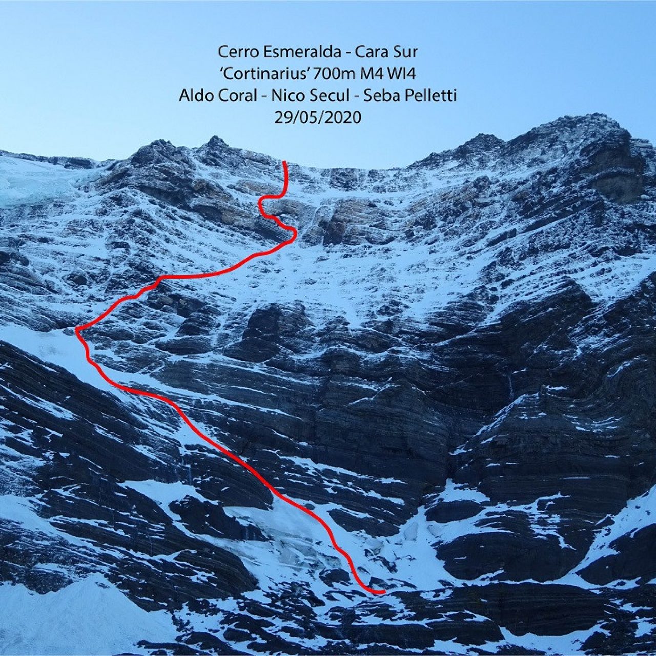 El 29 de mayo de 2020 desde Puerto Natales – Magallanes después de un bivouac cerca de la versante sur del Cerro Esmeralda en la cordillera Prat, Nicolas Secul, Sebastian Pelleti y Aldo Coral escalaron por primera vez la ruta nombrada “Cortinarius” en referencia a la seta de color lila que se encuentra en esos bosques y que describe genéricamente la escalada según las características físicas de este hongo descritas en una guía local, “delicada, resbalosa y difícil de manipular”.
