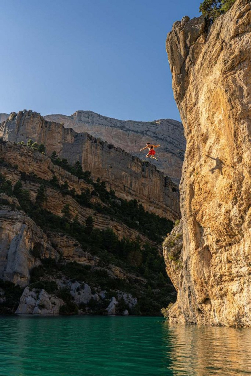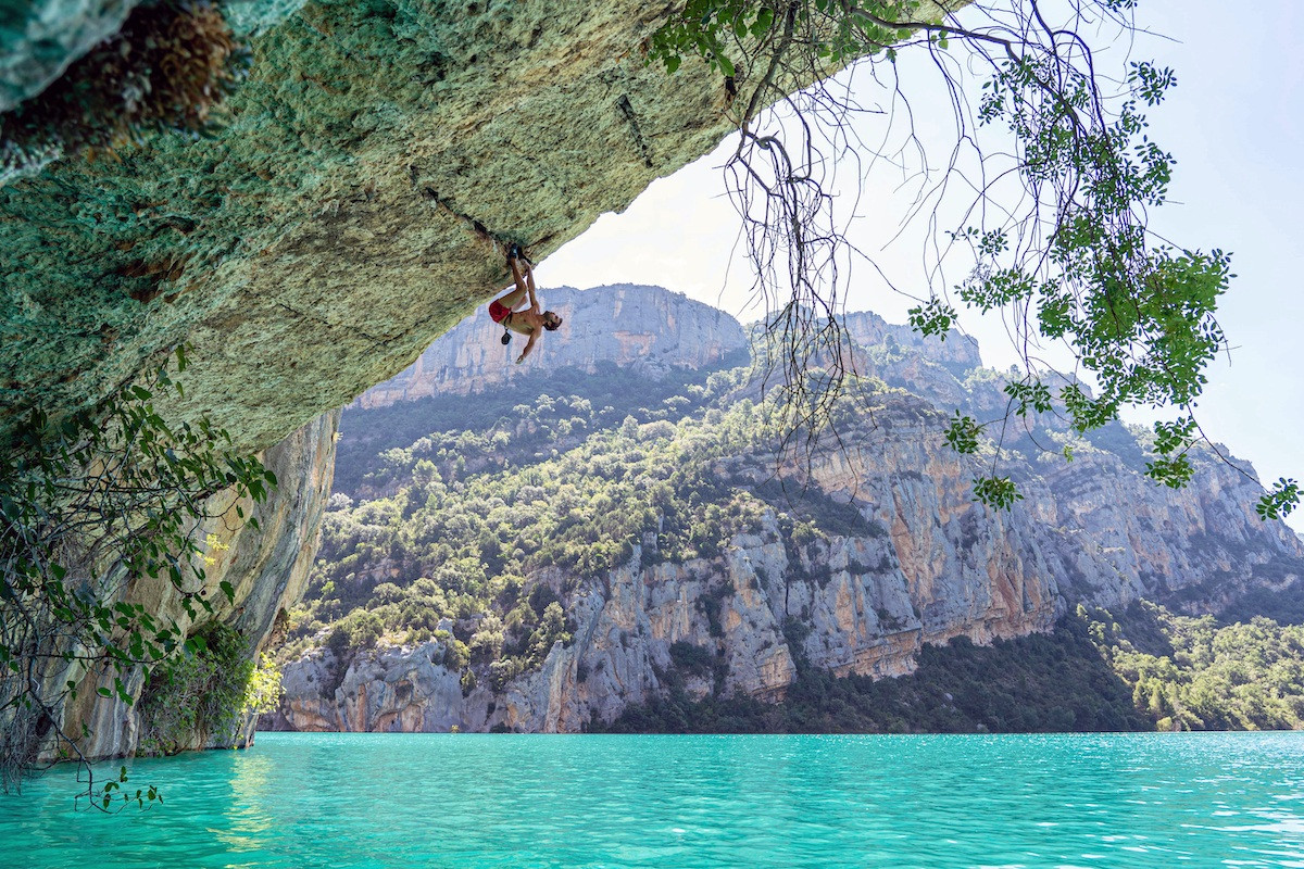 Este año producto de la pandemia prefirió no salir de Cataluña pero si practicar deep water soloing (Escalada de aguas profundas) como también se le denomina en el mundillo del trepe a esta corajuda disciplina. Así que fue a explorar lugares más cercanos a Barcelona, donde se encuentra afincado con su mujer y sus dos hijos hace ya varios años. El paradisíaco destino elegido fue Mont Rebei, ubicado aproximadamente a tres horas al noroeste de la ciudad condal, el maravilloso spot es un desfiladero remoto con un río de brillantes aguas turquesas que bañan las bases de empinados acantilados de piedra caliza.