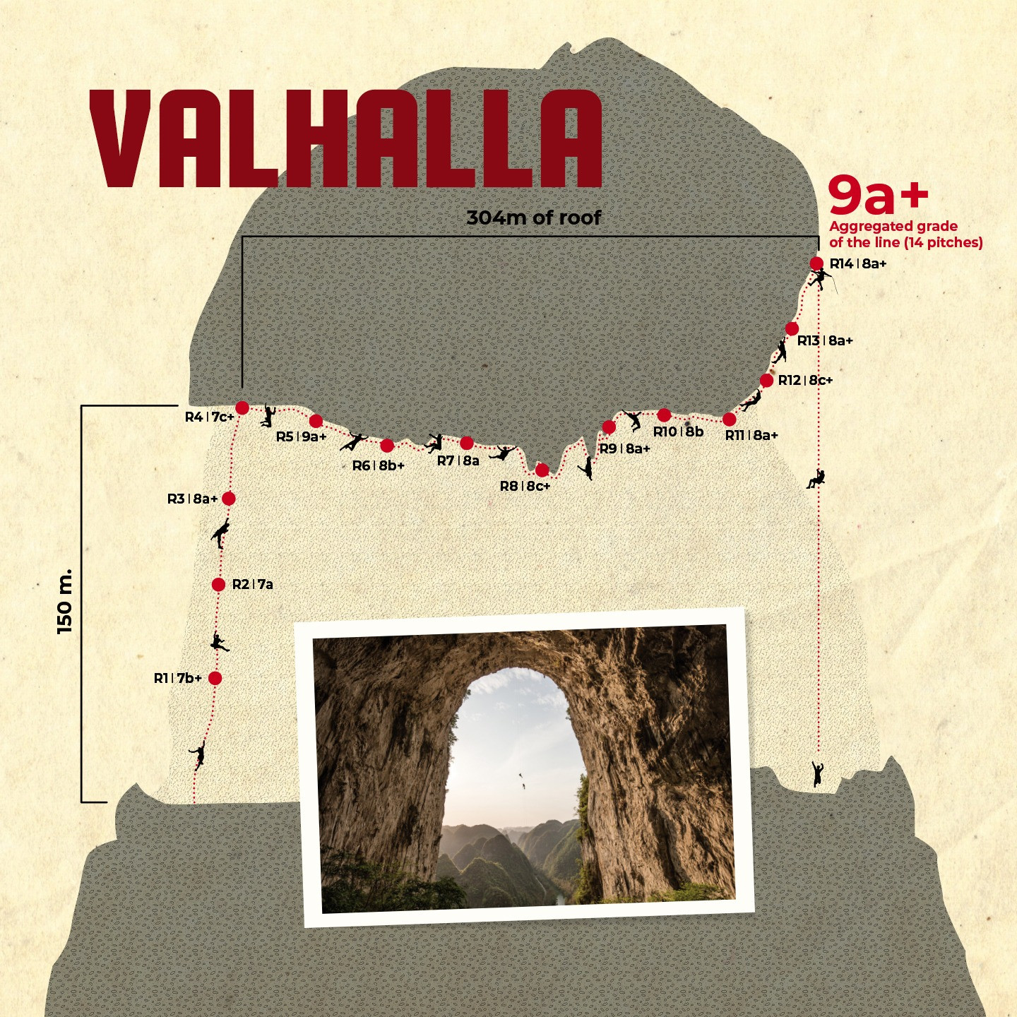 Trescientos ochenta metros de recorrido dan vida a esta vía de 14 largos, 50 horas de taladreo que se tradujeron en la instalación de 300 chapas, son solo algunos de los condimentos (Más escalada de la buena..obvio) que podrán ver en el estreno mundial que se realizará vía on line producto de la pandemia. Esto será desde del 2 al 4 de Octubre, cuando finalmente vea la luz el estreno mundial de Valhalla, el que incluirá entrevistas con amigos de Marín y destacados escaladores como son Chris Sharma y el gran Dani Andrada. Además Edu estará respondiendo preguntas vía Chat para quienes quieran saber más sobre el proyecto.