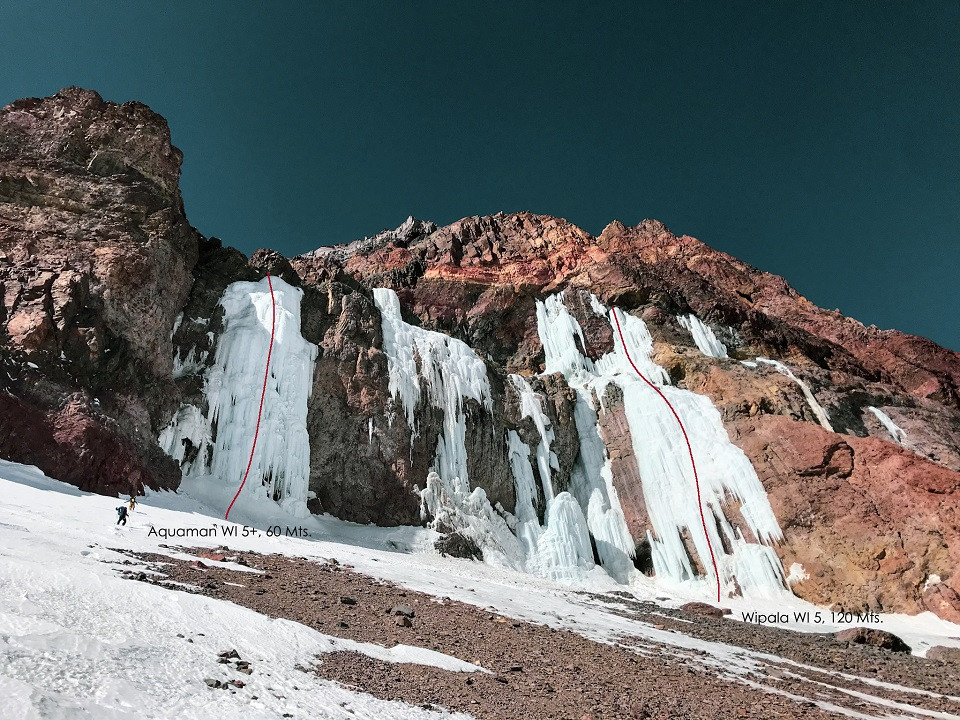 Este invierno Fuimos junto al grupo de @colectivoandino Seba Rojas y Diego Saez con la intención de escalar algunas cascadas y esquiar algo. Pudimos abrir tres hermosas cascadas “Wipala” (120 mt Wi5.), “Trayken” (60mt Wi 5+) y “Aquaman” (60mt Wi6).
