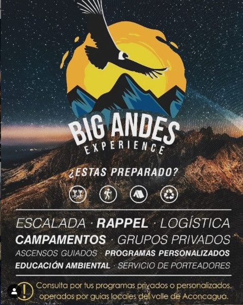 Javier Reyes y Eduardo Weber, los fundadores de Big Andes Experience, son guías de trekking-montaña, escaladores y esquiadores. Originarios del Valle del Aconcagua, invitan a motivarse, volver a salir al aire libre, educación ambiental, charlas, entre otras cosas, pero siempre con la base de desarrollar actividades de montaña y escalada.