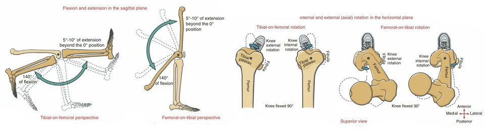 Fig. 1. Movimientos que permite la rodilla. Flexión, extensión, rotación interna y rotación externa, con y sin apoyo del pie.