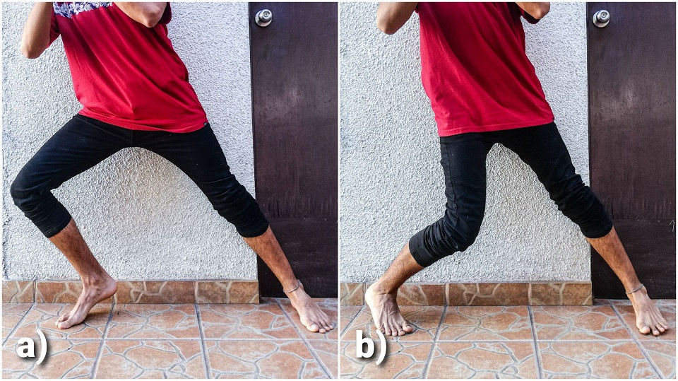 Fig. 10. a) Llevar peso hacia un lado, provocando flexión de la rodilla y elevación del talón, inclinando el tronco hacia la misma dirección. b) Llevar rodilla hacia adentro, manteniendo el enfoque en la cadera.