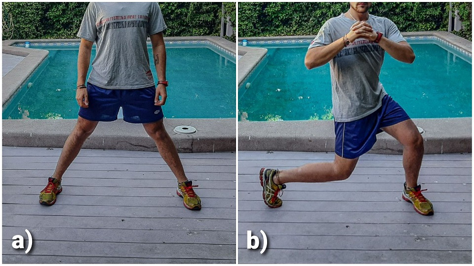 Fig. 11. a) Posición inicial con pies separados hacia los lados. b) Llevar rodilla a flexión junto a rotación interna de la cadera, pudiendo aumentar la profundidad según la inclinación de tronco y flexión de la rodilla contraria.