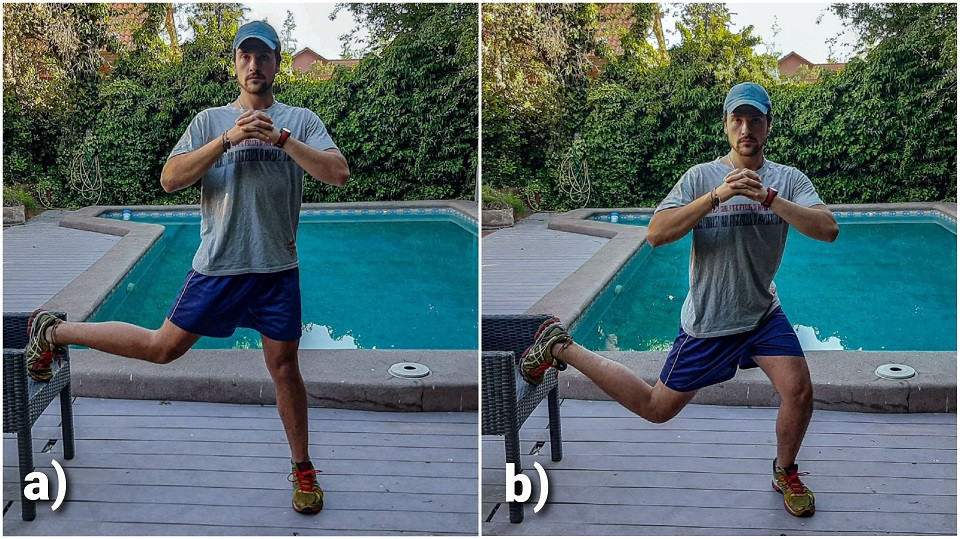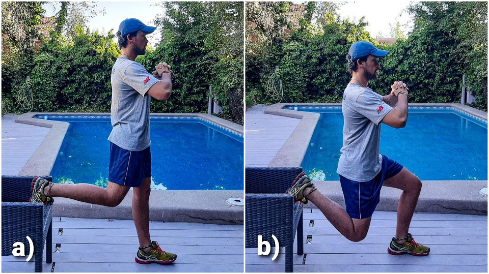 Fig. 9. Sentadilla búlgara. a) Posición inicial, con pie de atrás apoyado en la silla con la punta de los dedos. b) Gesto del ejercicio, donde uno baja manteniendo el enfoque en la flexión de la rodilla de atrás, sin inclinación del tronco.