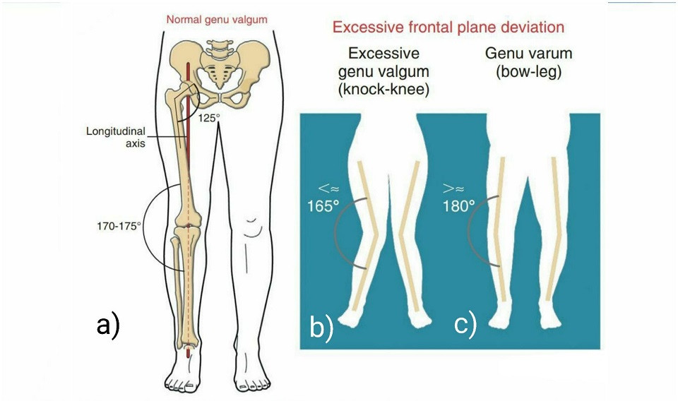 Fig. 2. Alineación de la rodilla. a) Alineación con valgo normal con ángulo entre 170-175°. b) Valgo excesivo con ángulo menor o igual 165°. c) Genu varo, donde el ángulo es mayor o igual a 180°.