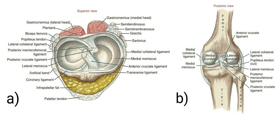Fig. 3. Anatomía de la rodilla. a) Corte transversal donde se ve la tibia desde arriba con la presencia de los meniscos, tendón patelar, ligamentos cruzados y colaterales, grasa infrapatelar y diferentes tendones. b) Visión posterior, donde se puede ver los ligamentos cruzados, colaterales y meniscos, entre otros.