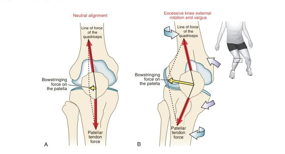 Fig. 6. a) Alineación neutral de la rodilla, donde se muestra la fuerza lateral característica que actúa sobre la rótula. b) Valgo excesivo de rodilla junto a rotación, el cual aumenta la fuerza hacia lateral sobre la rótula (cuerda de arco; flecha amarilla).