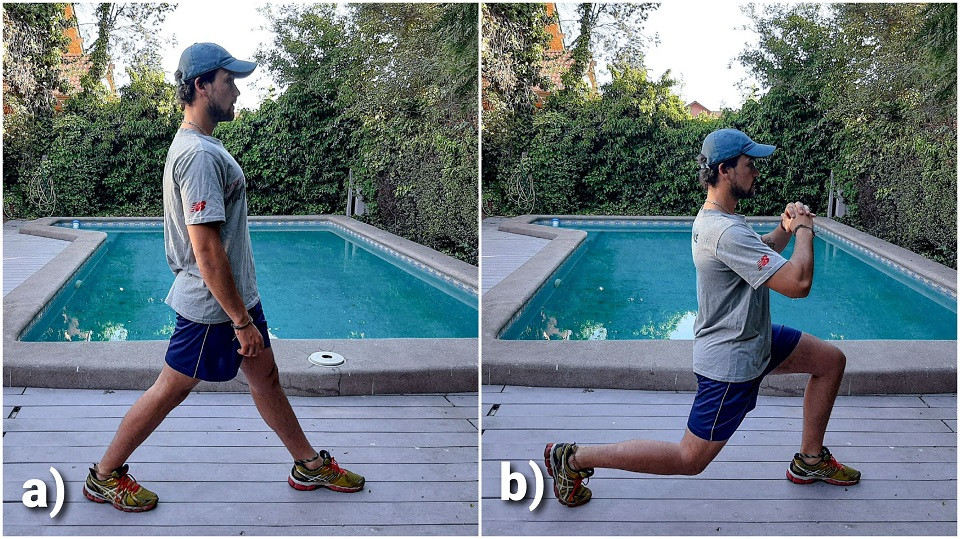 Fig. 7. a) Posición inicial, manteniendo un pie adelante y el otro atrás. b) Llevar peso hacia abajo flectando la rodilla de adelante y atrás, esta última puede variar el grado de flexión dependiendo de la distancia que tenga hacia atrás.