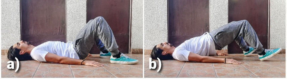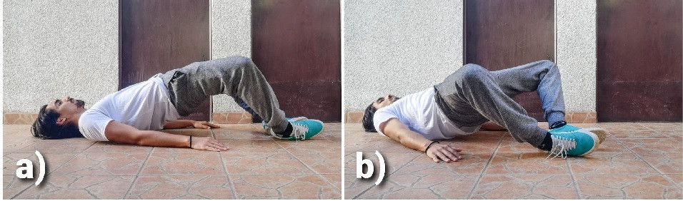 La forma más sencilla es el puente glúteo simple, el cual hay que acostarse boca arriba con rodillas flectadas y pies apoyados (fig. 10a) e ir levantando la pelvis (en retroversión) haciendo fuerza desde los talones (fig. 10b). Esto se puede realizar de múltiples maneras, desde una mantención de la posición hasta ir variando la flexión de la rodilla, pudiendo mantener las piernas más estiradas.