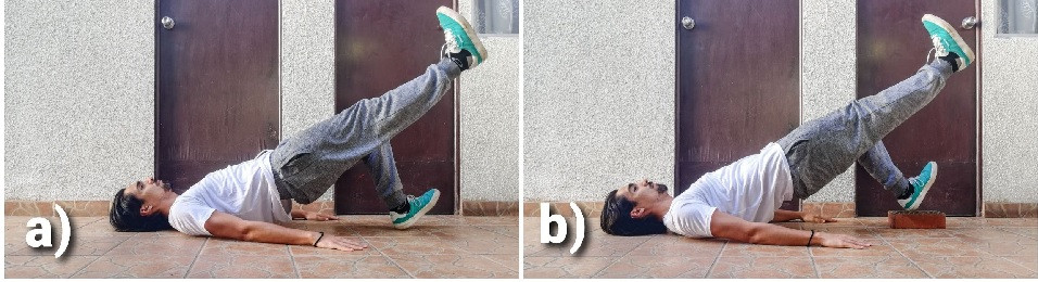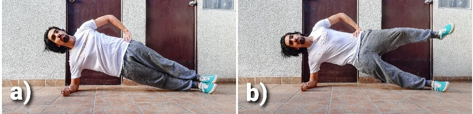 Una progresión de este ejercicio es levantar la pierna que no está en contacto con el suelo, lo cual va a aumentar la dificultad y esfuerzo de este (fig. 13b). Este se puede hacer mantención de la posición con pierna elevada o hacer repeticiones con está manteniendo la posición base.