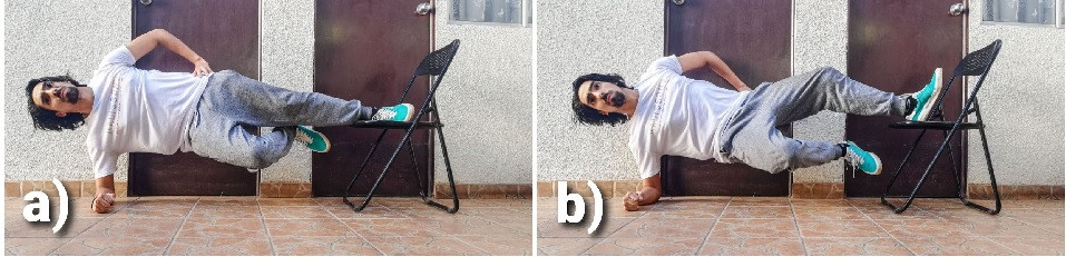 A diferencia del ejercicio anterior, esta variedad busca exponer la parte interna de la rodilla y de toda la pierna. El codo se coloca en la misma posición que el ejercicio anterior y el pie contrario se coloca en altura, ya sea en una silla, cajón, etc. En esta posición hay que levantar la cadera haciendo fuerza desde la cara interna del pie (fig. 13a). Este también se puede hacer con mantenciones o realizar una cantidad determinada de repeticiones, dependiendo del objetivo y tolerancia de cada persona. En caso de que sea muy complicada la posición, se puede acortar la palanca de la pierna, apoyando la rodilla flectada en la silla, pudiendo ser mejor tolerado.