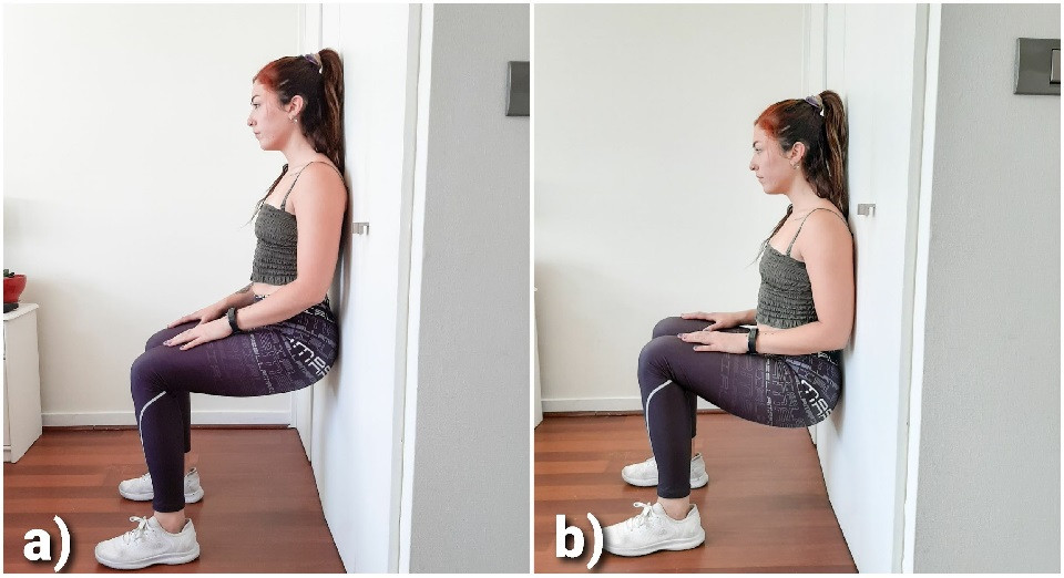 Este consiste en apoyar la espalda contra la pared de manera cómoda, simulando estar en una silla. Ejercicio útil para ir exponiendo la rodilla a diferentes grados de flexión, pudiendo variar desde rangos amplios a más profundos según tolerancia de cada persona (fig. 6). Esto se puede realizar con mantenciones según tiempo y tolerancia de cada persona.