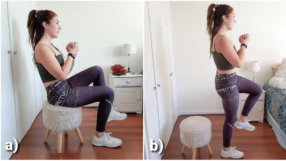 Una manera simple es utilizando una silla o cualquier lugar que sirva para sentarse, como un cajón, mueble, peldaño de una escalera, etc (fig. 7a). Aquí la idea es ponerse de pie en una pierna (fig. 7b) sin perder el equilibrio. Una manera de progresar es ir variando la altura de donde uno se sienta y en caso de que sea muy difícil hacer esto, simplemente se puede ir de la posición de pie (fig. 7b) e ir sentándose de manera controlada.