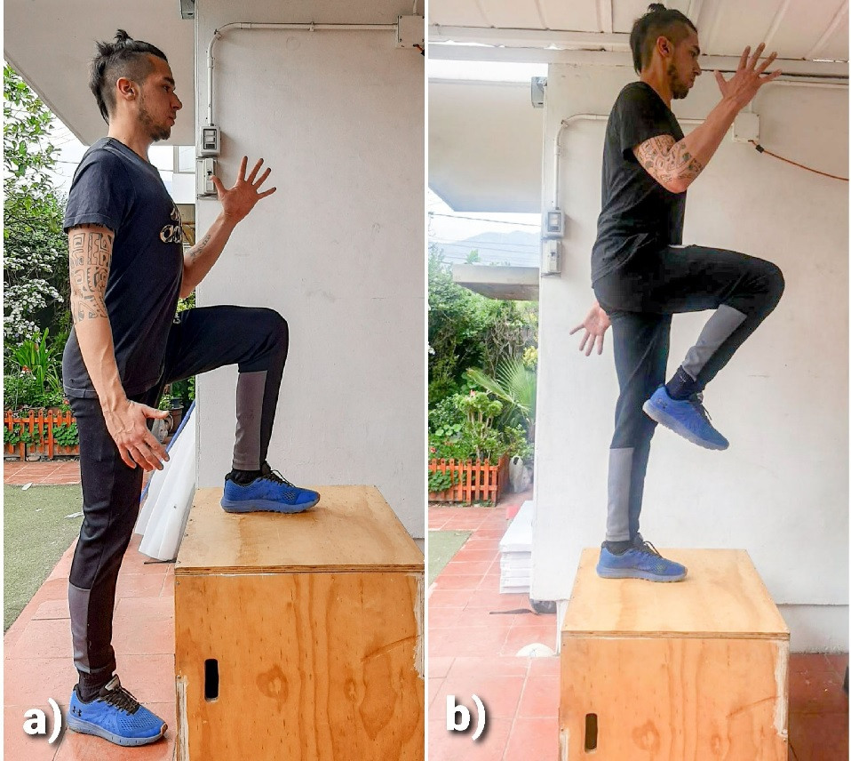 Otra manera de hacer esto es ponerse de pie hacia una altura mayor, como por ejemplo en un cajón (fig. 8a). Al igual que el ejercicio anterior, se puede realizar con cualquier objeto o lugar que permita hacer el gesto, así colocarse de pie de manera controlada (fig. 8b). En ambos ejercicios se puede ir variando la profundidad y grado de flexión de la rodilla, así poder hacerlo de la manera más similar posible de un paso real escalando.
