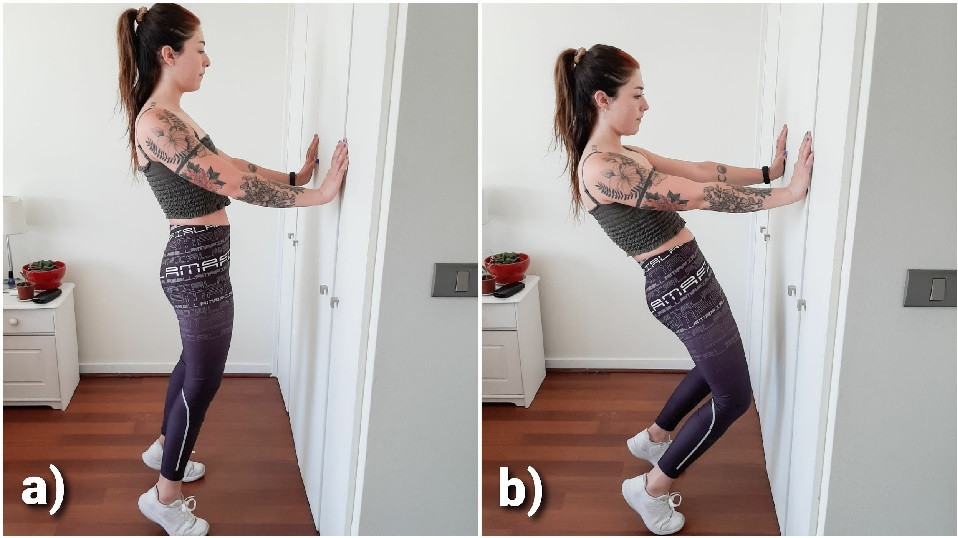 Ejercicio útil para exponer gradualmente a que la rodilla sobrepase el nivel de los pies, lo cual es común al escalar. Estando de pie con manos apoyadas en alguna superficie (fig. 9a), se debe ir flectando rodillas hacia delante manteniendo pelvis y tronco en una línea (pelvis en retroversión) lo que también llevará a los pies a ponerse en punta para poder lograr la ejecución del ejercicio (fig. 9b). Según las características de cada persona se puede ir variando la amplitud del movimiento, pudiendo aumentar la flexión de rodilla y con ello la dificultad.