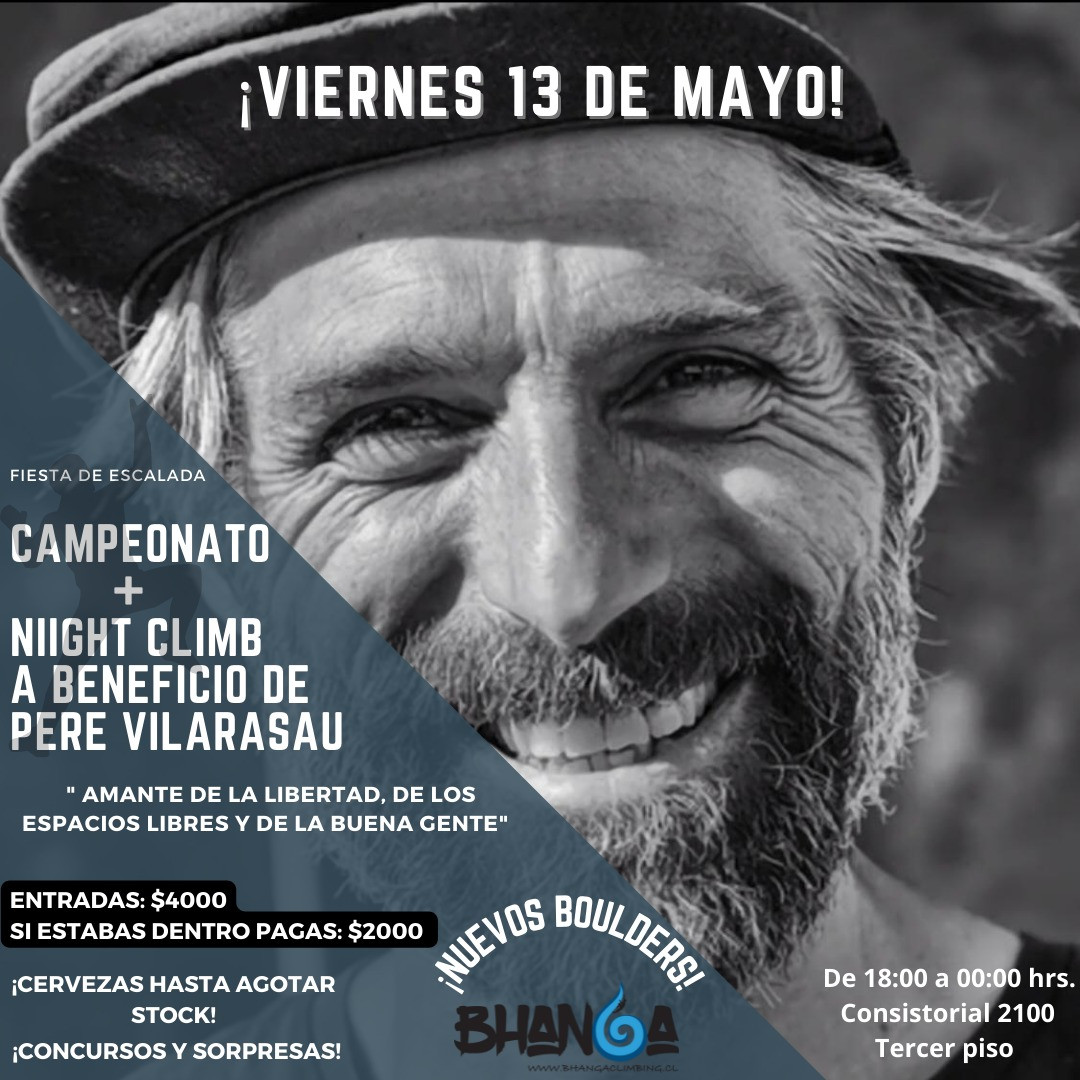 Debido a las altas cifras que requirió su operación y a todo el tiempo que necesitará en rehabilitación, hemos organizado un Campeonato con Night Climb en beneficio del Pera, para el día viernes 13 de Mayo desde las 18:00 Hrs, en la sala de escalada Bhanga Climbing, con el fin de juntarnos como comunidad, para recaudar recursos y ayudar a esta gran persona.