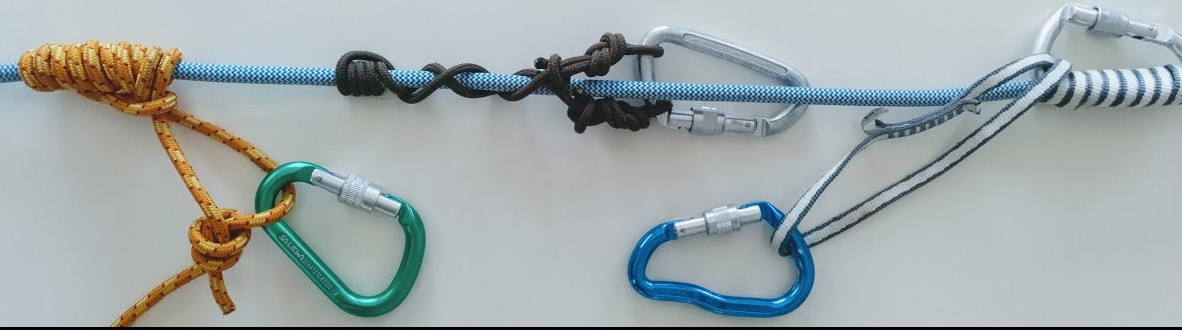 Los nudos de unión en el cordín o las costuras en el caso de las cintas, siempre deberán quedar fuera del apoyo del mosquetón en el seno del nudo y/o fuera de la superficie de rozamiento directo con la cuerda donde lo realicemos. Esto, para evitar debilitamientos, desajustes ó mal funcionamiento de los nudos.